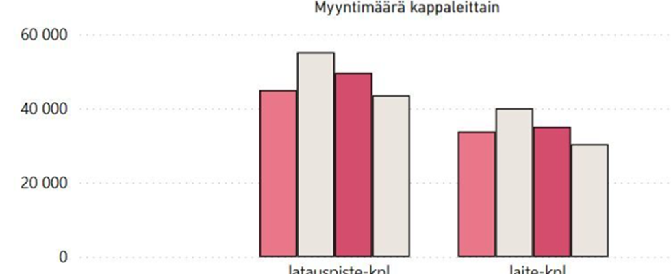 Kiinteistöihin asennettavia sähköautojen latauslaitteita myytiin viime vuonna 30 382 kappaletta, mikä on 13,3 prosenttia vähemmän kuin vuotta aiemmin, kertoo Sähköteknisen kaupan liiton tilasto.